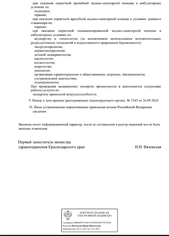 Многопрофильный медицинский центр. Осуществляет консультативный и диагностический прием взрослых и детей. В клинике работают специалисты по направлениям гастроэнтерологии, урологии, гинекологии, кардиологии, неврологии, терапии и т.д. Прием проводится по предварительной записи.