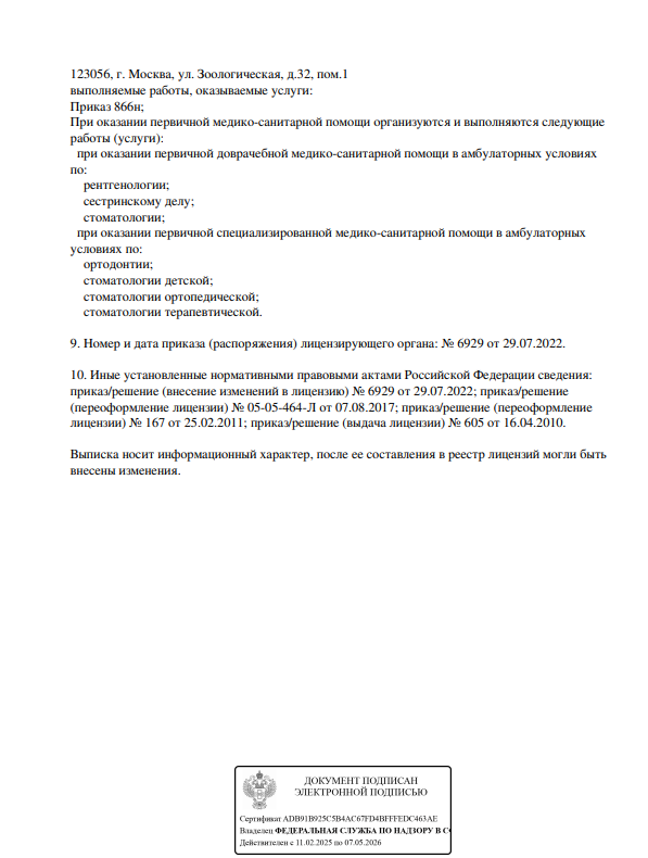 Предоставляет следующие услуги: восстановление зубной эмали и формы зубов, реставрацию зубов, молочных зубов, эстетическую реставрацию, специализируется на терапевтической стоматологии, лечении кист зубов и др.