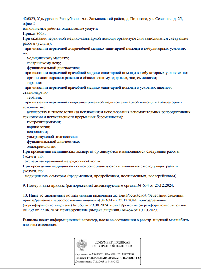 Многопрофильный медицинский центр. Осуществляет консультативный и диагностический прием взрослых и детей. В клинике работают специалисты по направлениям гинекологии, эндокринологии, урологии, стоматологии, дерматологии и т.д.