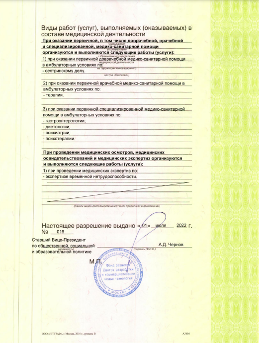 Возможна запись на прием к офтальмологу, гинекологу, урологу, неврологу, аллергологу, иммунологу, хирургу, дерматологу, венерологу, эндокринологу, оториноларингологу, ортопеду, специалисту по ведению беременности, сделать УЗИ, рентген, пройти функциональную диагностику, сдать все виды анализов, записаться на курс физиотерапии, мануальной терапии, медицинского массажа, иглорефлексотерапии, гирудотерапии, комплексного очищения организма.