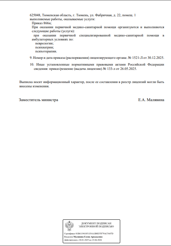 Специализируется на диагностике и лечении таких психических расстройств, как депрессия, маниакально-депрессивный психоз, панические расстройства, навязчивые состояния, страхи, фобии, шизофрения, неконтролируемая агрессия, булимия и анорексия, апатия и вялость.