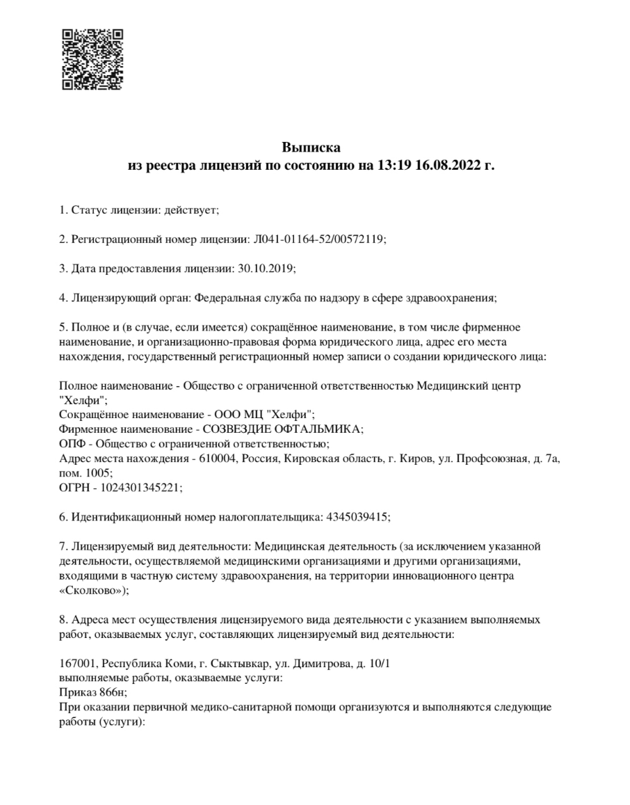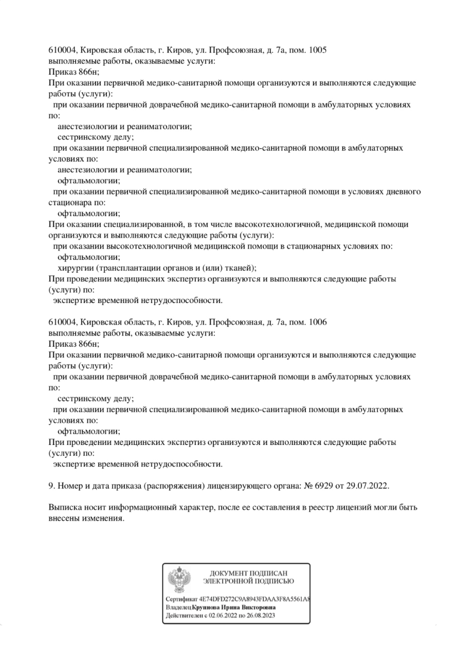 Офтальмологическая клиника. Оказывает офтальмологическую помощь. Клиника оснащена микрохирургическим инструментарием. Основными направлениями работы клиники являются: ультразвуковая факоэмульсификация катаракты с имплантацией эластичных интраокулярных линз (ФЭК ИОЛ) различных модификаций и фирм-производителей, в том числе мультифокальных линз и линз с асферической оптикой, лазерная коррекция аномалий рефракции методами ReLex Smile, Femto-Super Lasik, Femto Lasik, Lasik, ФРК (фоторефракционная кератэктомия), комплексное лечение глаукомы с использованием микроинвазивной и лазерной хирургии, в т. ч. непроникающая глубокая склерэктомия, интенсивная терапия инфекционных заболеваний глаз, хирургия придаточного аппарата глаза (слёзные пути, веки, наружные прямые мышцы).