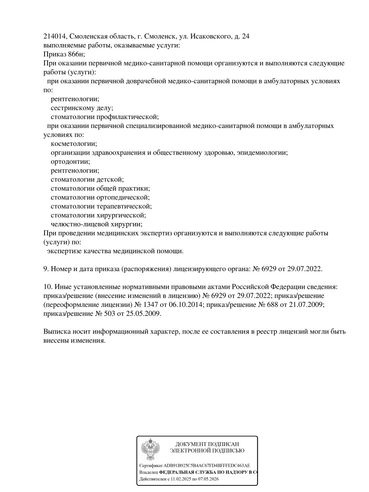 Предоставляет следующие услуги: восстановление зубной эмали и формы зубов, реставрацию зубов, молочных зубов, эстетическую реставрацию, специализируется на терапевтической стоматологии, лечении кист зубов и др.