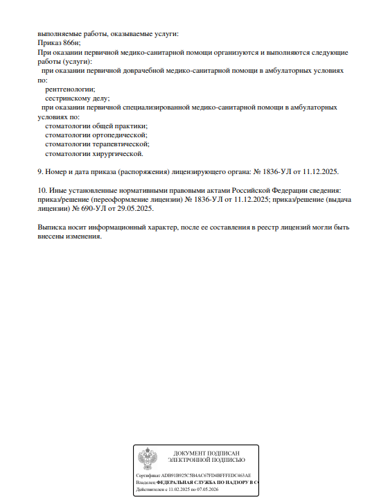 Стоматологическая клиника предоставляет услуги по стоматологии, включая терапию, ортопедию, ортодонтию, хирургию, имплантацию. Прием проводится по предварительной записи.