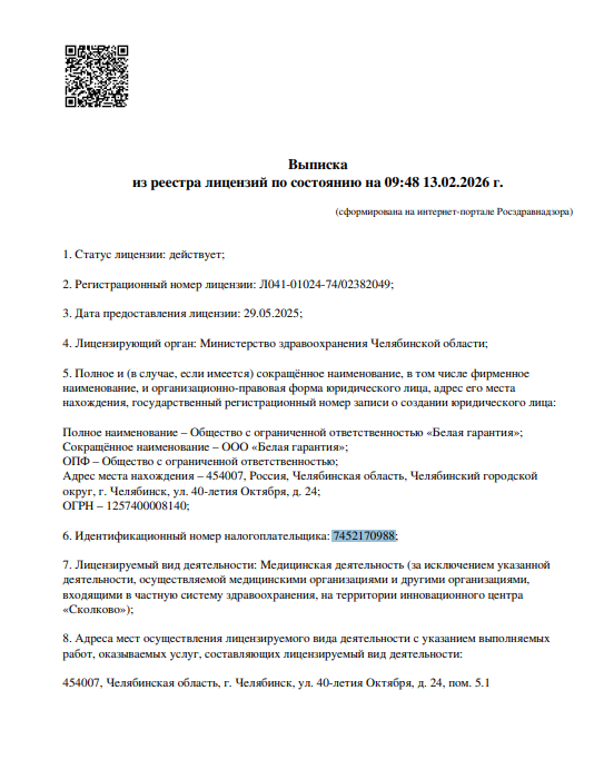 Стоматология Белая Гарантия предоставляет услуги по стоматологии, включая терапию, ортопедию, ортодонтию, хирургию, имплантацию. Прием проводится по предварительной записи.