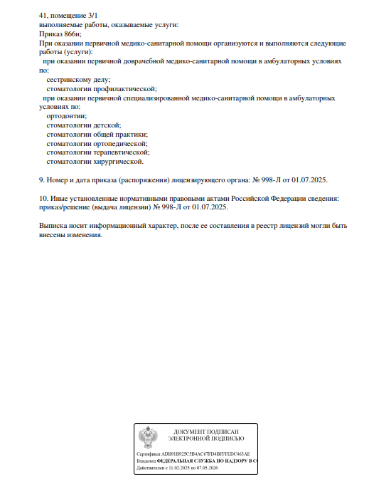 Стоматологическая клиника предоставляет услуги по стоматологии, включая терапию, ортопедию, ортодонтию, хирургию, имплантацию. Прием проводится по предварительной записи.