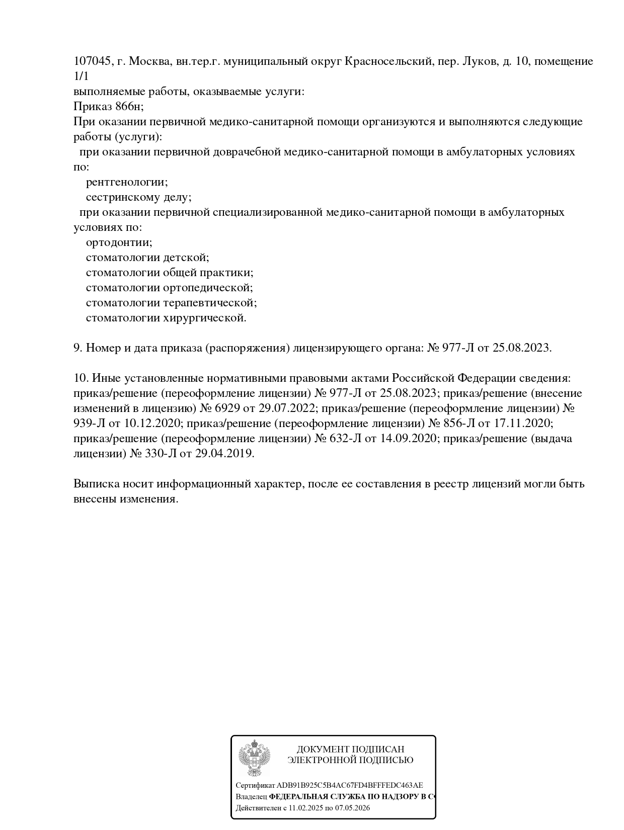 Предоставляет следующие услуги: восстановление зубной эмали и формы зубов, реставрацию зубов, молочных зубов, эстетическую реставрацию, специализируется на терапевтической стоматологии, лечении кист зубов и др.Проводит удаление зубов любой сложности (в том числе зубов мудрости), пластику перфорации верхнечелюстной пазухи, вскрытие абсцессов, иссечение капюшона, удаление доброкачественных образований.