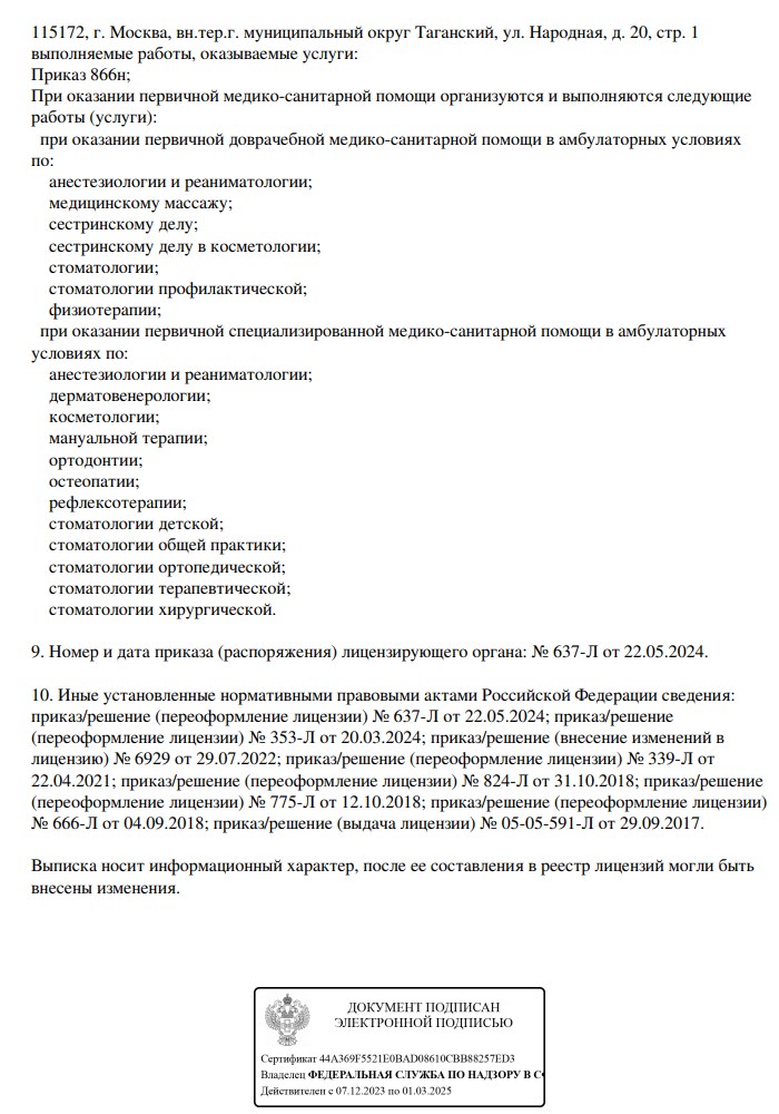 Стоматологическая клиника предоставляет услуги по стоматологии, включая терапию, ортопедию, ортодонтию, хирургию, имплантацию. Прием проводится по предварительной записи.