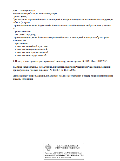 Стоматологическая клиника предоставляет услуги по стоматологии, включая терапию, ортопедию, ортодонтию, хирургию, имплантацию. Прием проводится по предварительной записи.