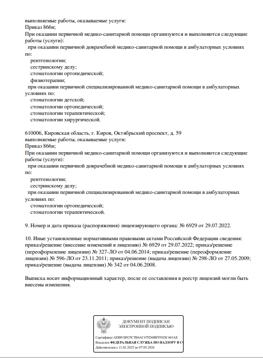 Предоставляет следующие услуги: восстановление зубной эмали и формы зубов, реставрацию зубов, молочных зубов, эстетическую реставрацию, специализируется на терапевтической стоматологии, лечении кист зубов и др.