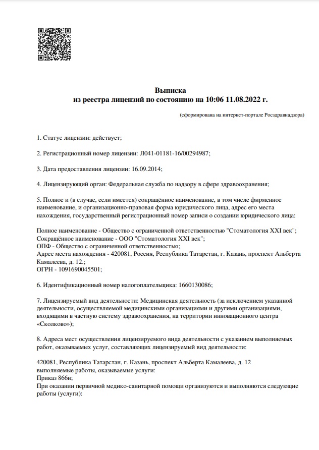 Клиника предлагает широкий спектр стоматологических услуг в г. Казани. В клинике можно вылечить кариес, провести лечение каналов под микроскопом, исправить прикус с помощью элайнеров или брекет-системы, пройти сплинт-терапию, проходить профессиональную чистку и отбеливание, полностью восстановить жевательную функцию с помощью имплантации и протезирования и эстетику зубов. Пациенты клиники получают комплексный и ответственный подход к лечению зубов.
