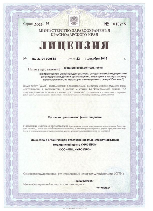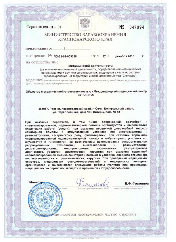 Международный медицинский центр УРО-ПРО в г. Сочи – клиника с высокотехнологичным оборудованием. В клинике работают специалисты по направлениям урологии, колопроктологии, сексологии, гинекологии (в том числе эстетической), хирургии, флебологии, трихологии, дерматологии и косметологии, УЗИ, есть кабинет физио и озонотерапии. В отделении проктологии работают специалисты мужчины и женщины.
